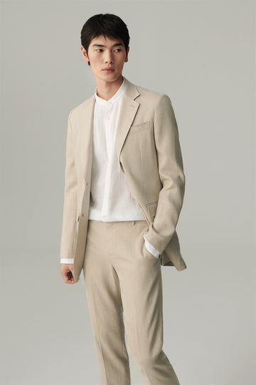 • Three-quarter front view showing the notch lapel and relaxed straight silhouette. Man wearing a natural beige undyed linen blazer with straight relaxed fit, styled with matching linen trousers, full-length front view.