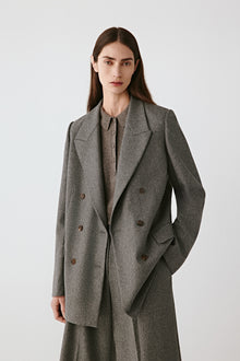 • Front view of the grey melange double-breasted blazer showing clean tailored lines.