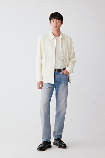 • Full-length front view of a male model wearing a light grey worsted wool and silk jacket with stand collar and zip fastening, paired with off-white trousers. Three-quarter front view showing the clean shoulder line and structured yet fluid silhouette.