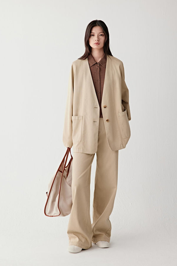 Crafted from cotton stretch denim, this jacket combines natural structure with subtle flexibility. The fabric maintains a clean silhouette while allowing ease of movement. Designed with a straight cut, a V neckline and patch pockets, it follows the body with balance and simplicity.