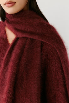 • Woman wearing a red knit scarf with fringed edges and a matching burgundy cap over a black coat on a light background
