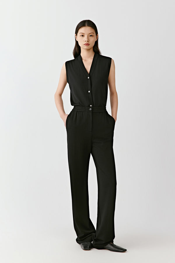 Cut from deep black combed wool terry, these trousers combine softness with fluid movement. The elasticated waistband with button detail brings comfort while maintaining clean lines.