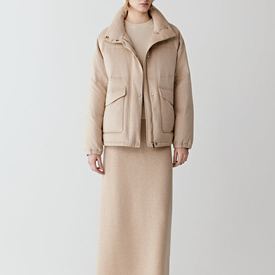 Crafted from undyed camel and silk tweed, this down coat retains the fibre’s natural texture and shades. Lightly filled with natural down, it combines warmth and comfort with clean, streamlined lines.