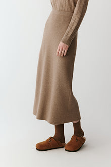 • Side view capturing the light movement of the knit along the leg. Model wearing a camel undyed cashmere and wool midi skirt with a matching knit top for a tonal silhouette.
