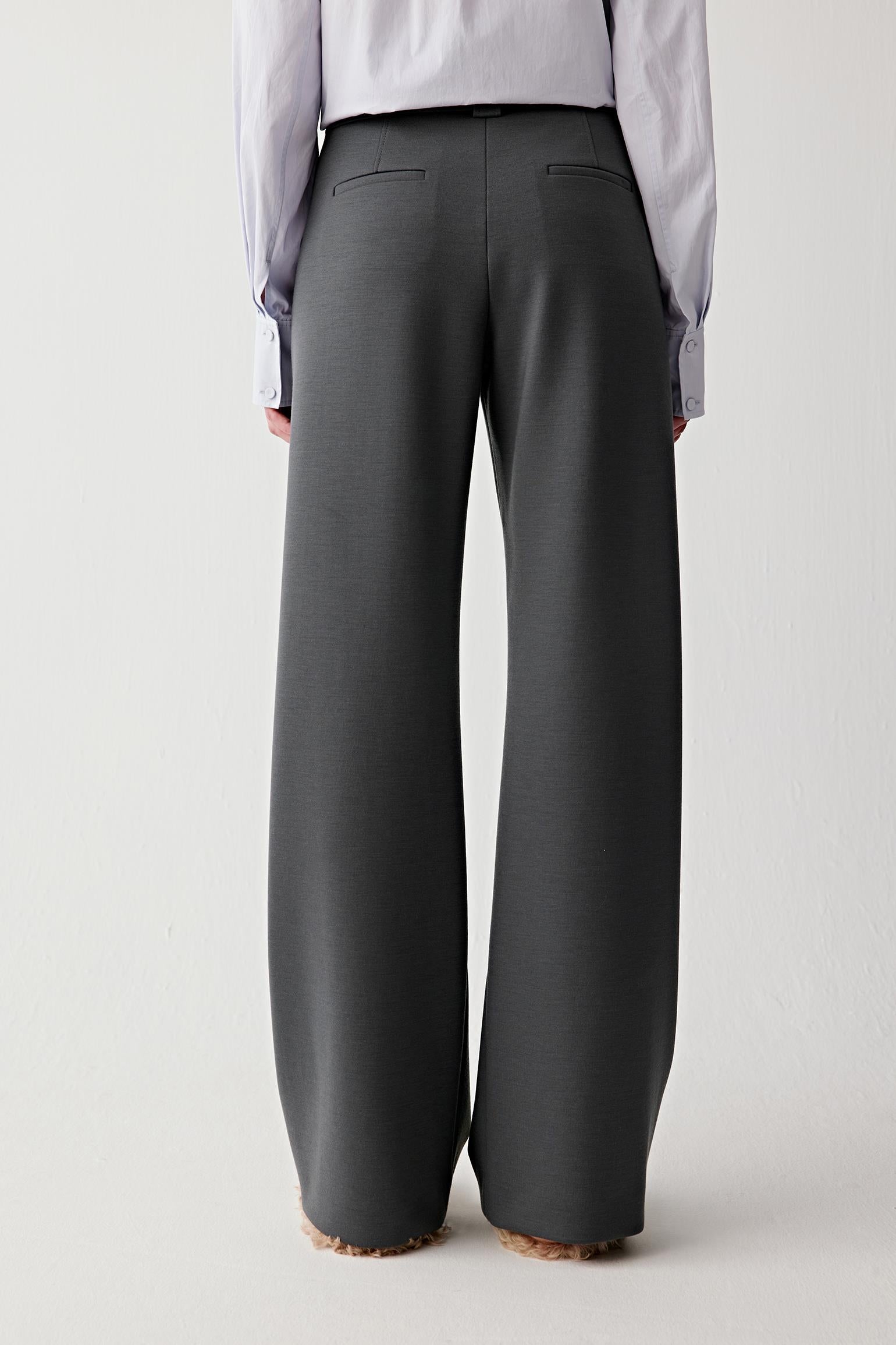 La jambe droite et large, associée à un détail de poche arrière discret, compose une silhouette équilibrée et allongée. Décliné dans un gris anthracite profond, il met en valeur la surface lisse et structurée de la matière.