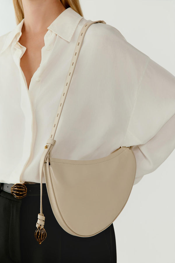 Confectionné en cuir de vache lisse avec une doublure en croûte de cuir, ce sac épaule demi-lune est pensé pour accompagner le quotidien en toute simplicité.