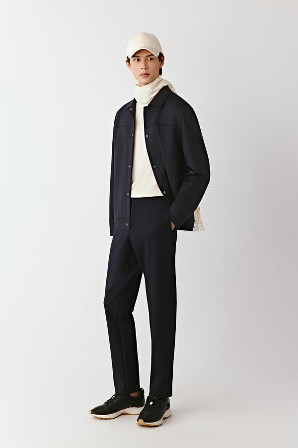 Ce pantalon bleu nuit est confectionné en jersey de laine peignée avec une touche d’élasthanne, pour une liberté de mouvement optimale. Sa texture dense et fluide épouse les lignes du corps tout en assurant confort et maintien.