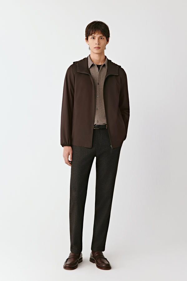 Confectionnée dans un mélange léger de laine peignée et de soie, cette veste est un essentiel intemporel. Sa fibre naturelle révèle une teinte brun profond et des lignes épurées. La capuche ajustable et les poignets élastiqués assurent confort et aisance au quotidien.