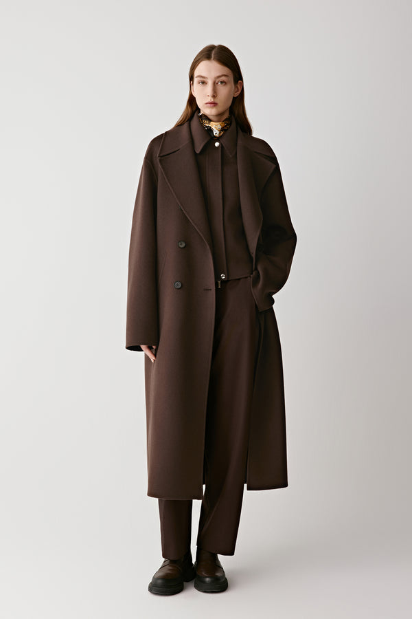 Confectionné en laine et cachemire double face, ce manteau marron foncé allie douceur et légèreté.